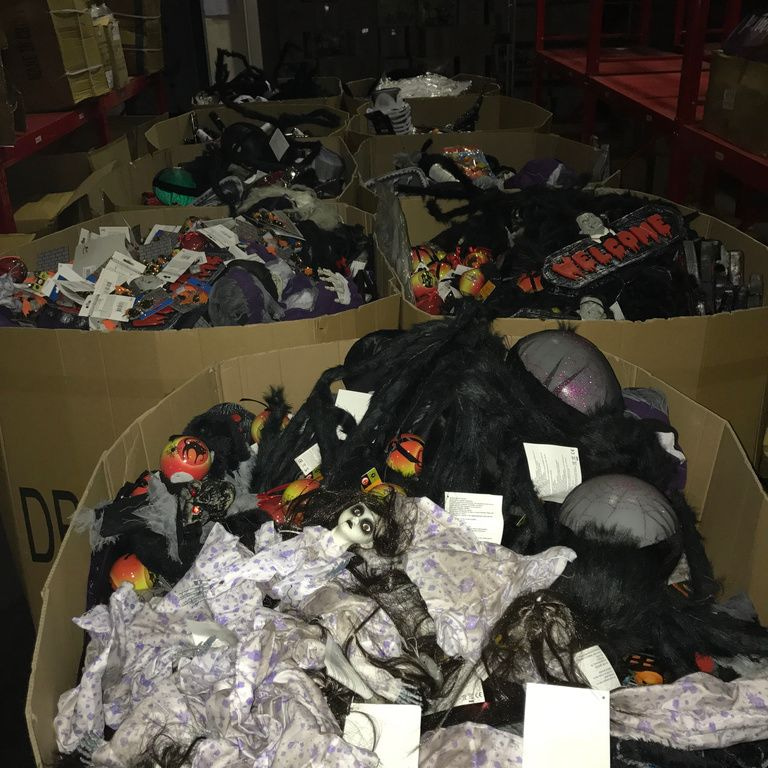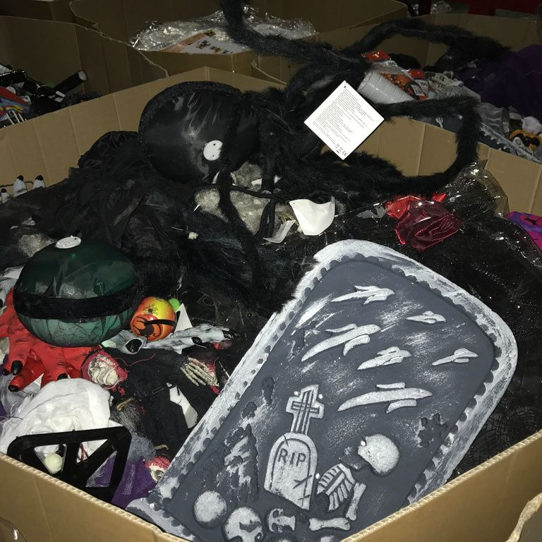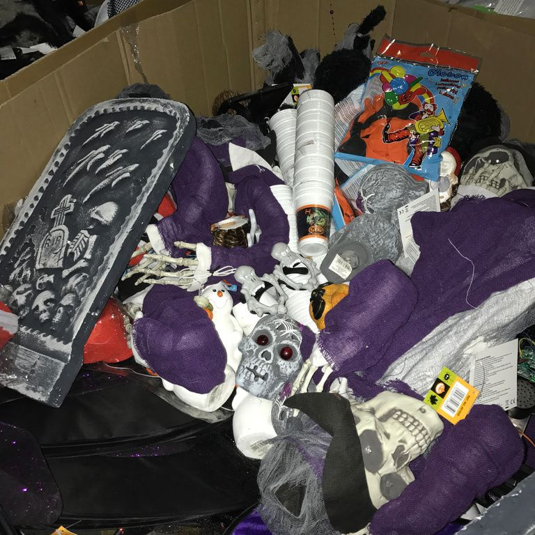 9x Palletboxen with mix Halloween items. Pallet size: 120 x 80 x 100 Cm.